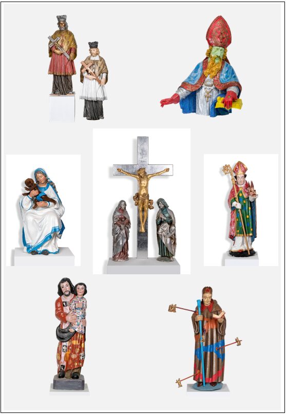 Auf dieser Grundlage und mit dem Wunsch die traditionellen Farbfassungen der historischen Skulpturen in das 20. Jhd. zu überführen, konnten dann weitere „Kunstharz-Doubletten“ neu interpretiert und gefasst werden.