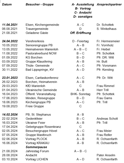 Die weiteren Termine für Veranstaltungen im „Forum Misericordia“ werden je nach Möglichkeit mit den Geistlichen abgesprochen und hier rechtzeitig bekannt gegeben.